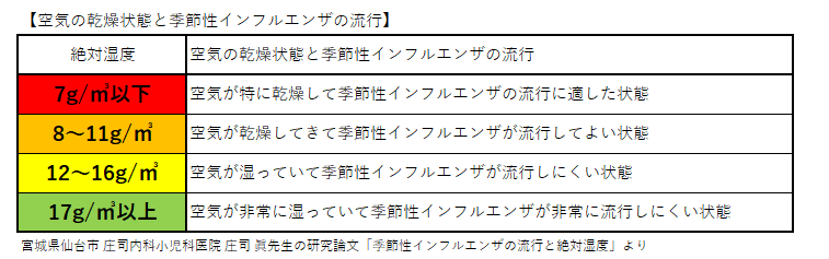 庄司内科小児科医院 庄司 眞先生の研究により、絶対湿度と季節性インフルエンザの流行との相関関係が調べられ、絶対湿度が11g/m³以下になると季節性インフルエンザの流行が始まることが報告されています。