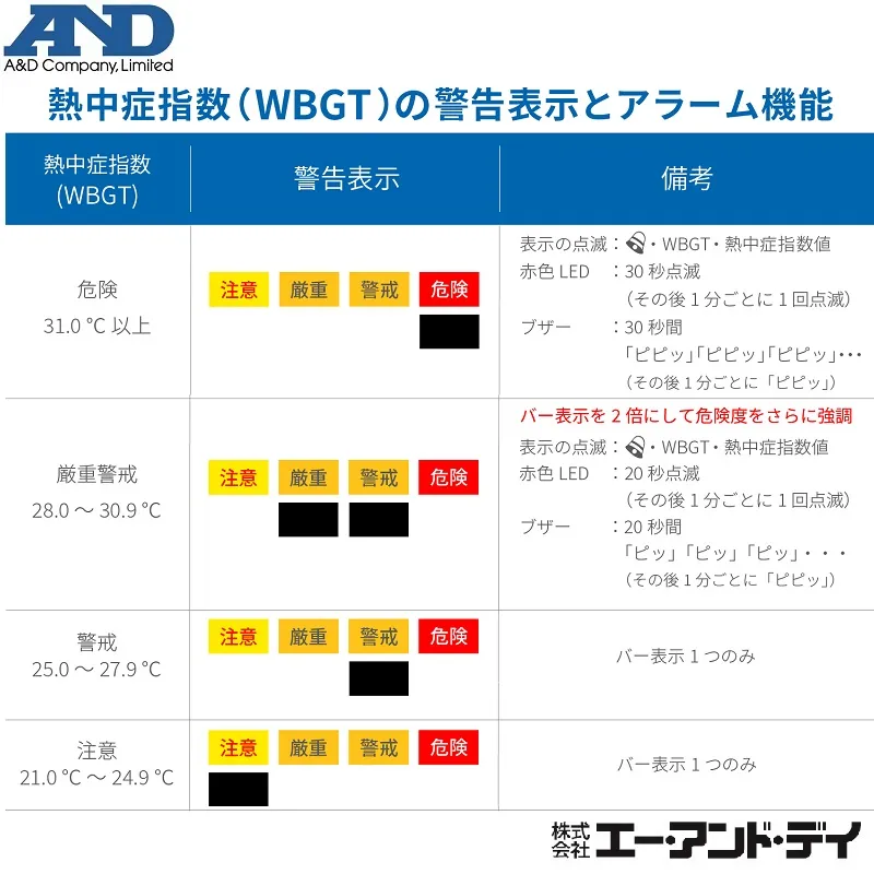 エー・アンド・デイでは、熱中症予防対策の啓発の一環として、暑さ指数(WBGT)を具体的にわかりやすく「熱中症指数」と呼称しています。