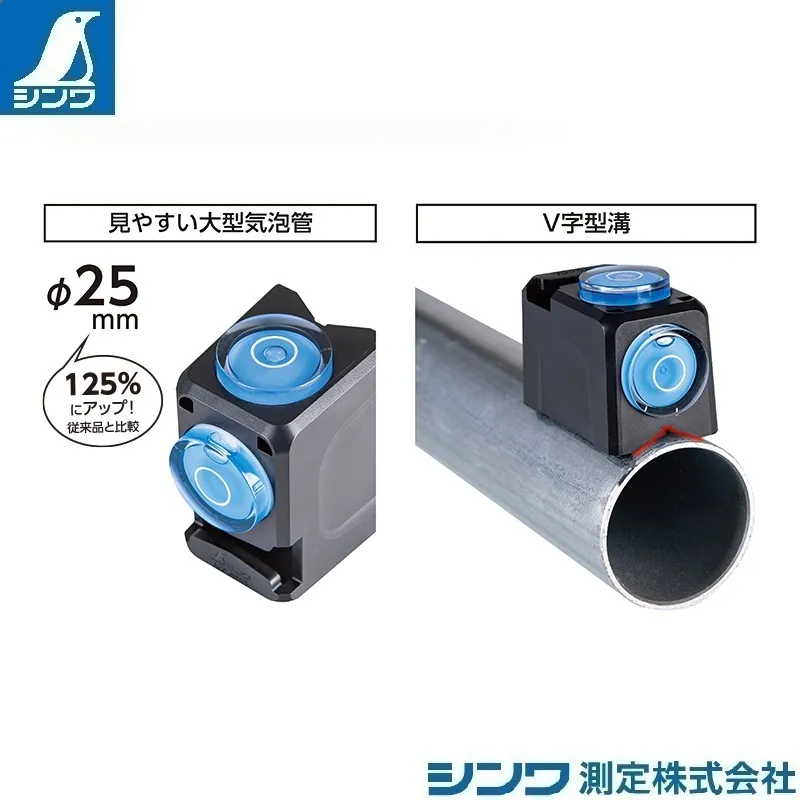 シンワのミニレベルRevo:キューブ型は、ポールやパイプの水平・垂直確認ができるV字溝が付いています。