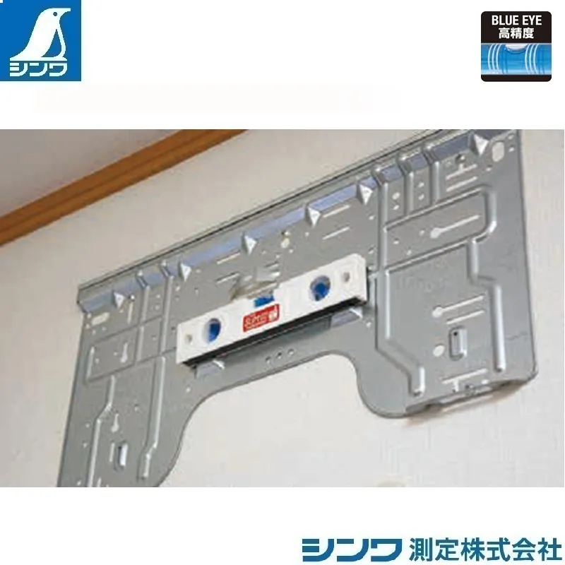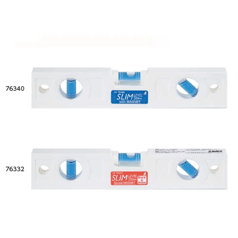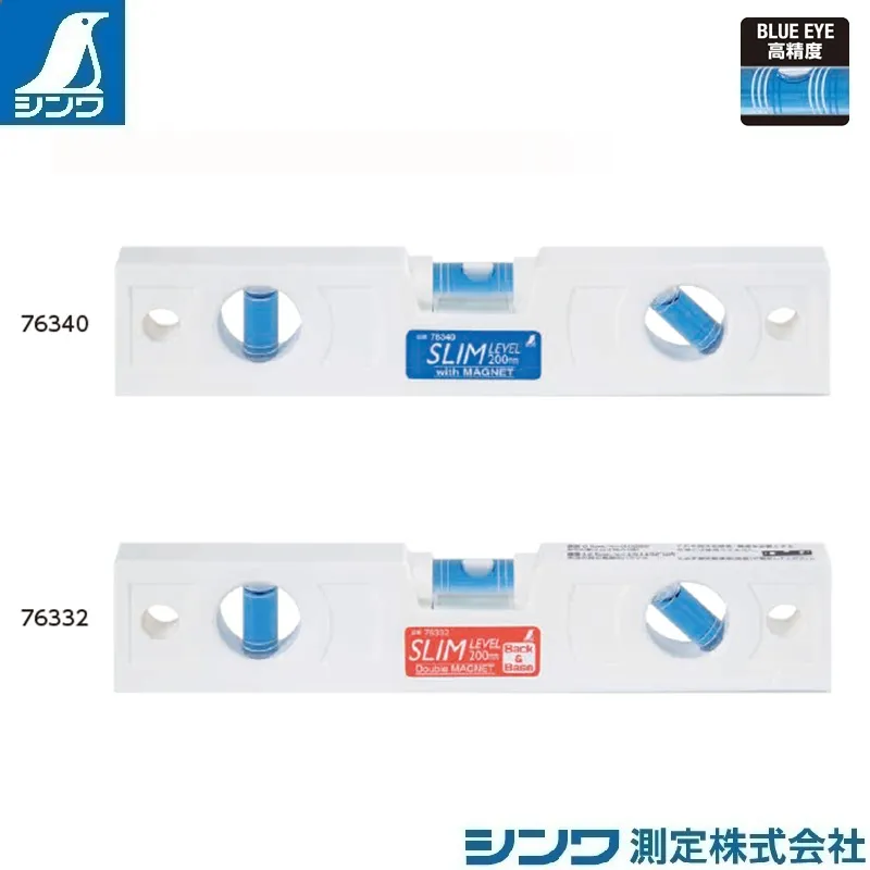 シンワのスリムレベルは、携帯に便利なスリム形状です。クリアブルーの溶液とホワイトラインで視認性の高い気泡管「BLUE EYE」を採用しました。また、水平気泡管は、蛍光シート付きです。