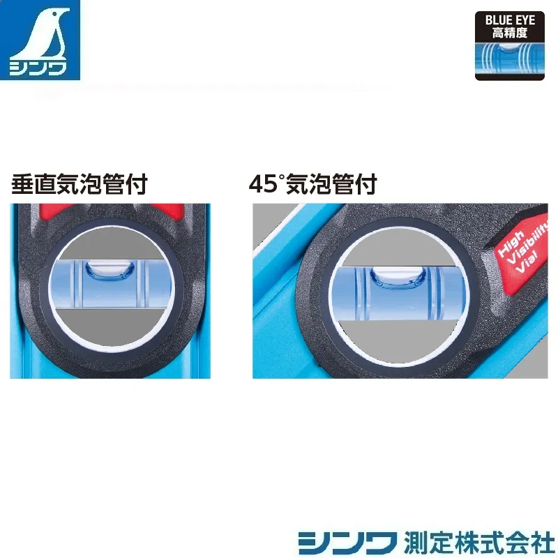 「BLUE EYE」は、クリアブルーの溶液とホワイトラインで視認性の高い気泡管です。従来の気泡管は目盛が黒色のため、管の向こう側の目盛と重なり、角度によって見えにくい場合がありますが、「BLUE EYE」は、管の向こう側の目盛が白色で目立ちにくいため、目盛が重なっても見やすいのが特長です。