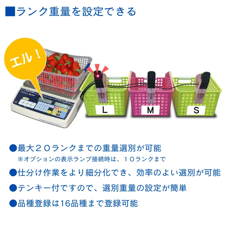 ランク重量を設定することで、最大20ランクまでの重量選別が可能です。仕分け作業をより細分化でき、効率のよい選別が可能です。