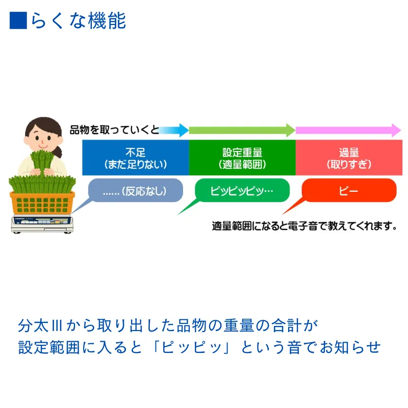 分太Ⅲから取り出した品物の重量の合計が設定範囲に入ると、「ピッピッ」という音でお知らせする「らくな機能」を搭載しています。