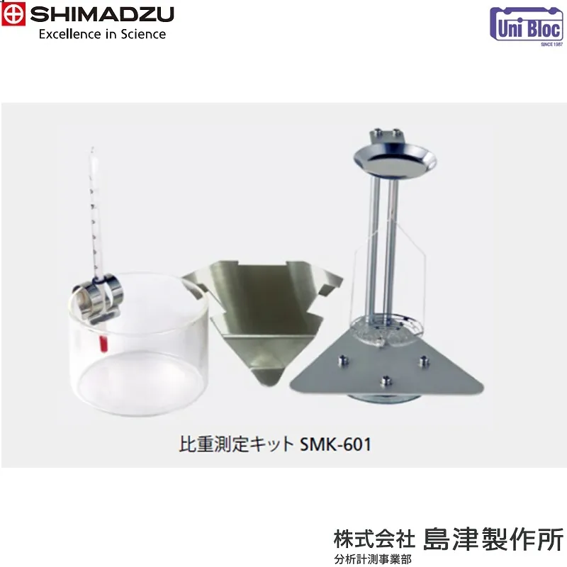 SHIMADZUの「比重測定装置 AP W-AD+SMK-601シリーズ」は、分析天びんAP W-ADシリーズにオプションの比重測定キット「SMK-601」を取り付けたセット商品です。