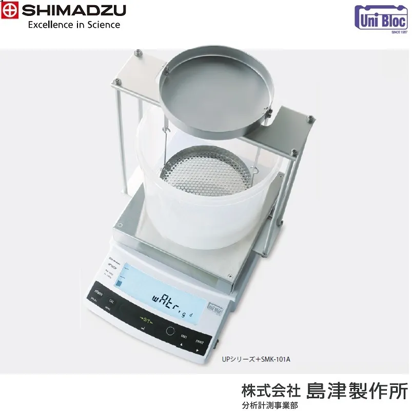 SHIMADZUの「比重測定装置 UP-X+SMK-102シリーズ」は、分析天びんUP-Xシリーズの小皿タイプににオプションの比重測定キット「SMK-102」を取り付けたセット商品です。