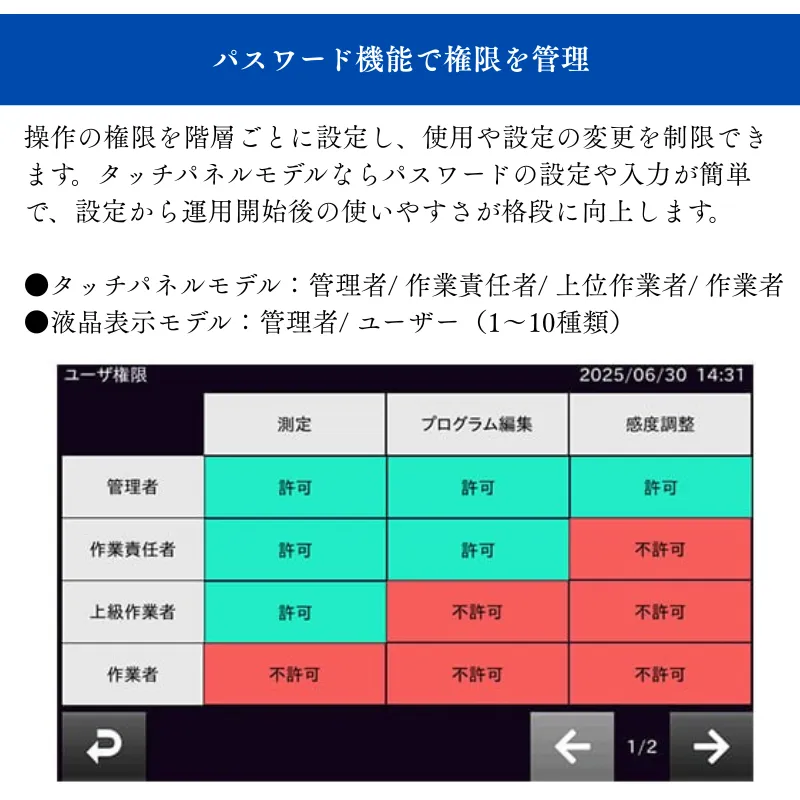 タッチパネルモデル:管理者/ 作業責任者/ 上位作業者/ 作業者